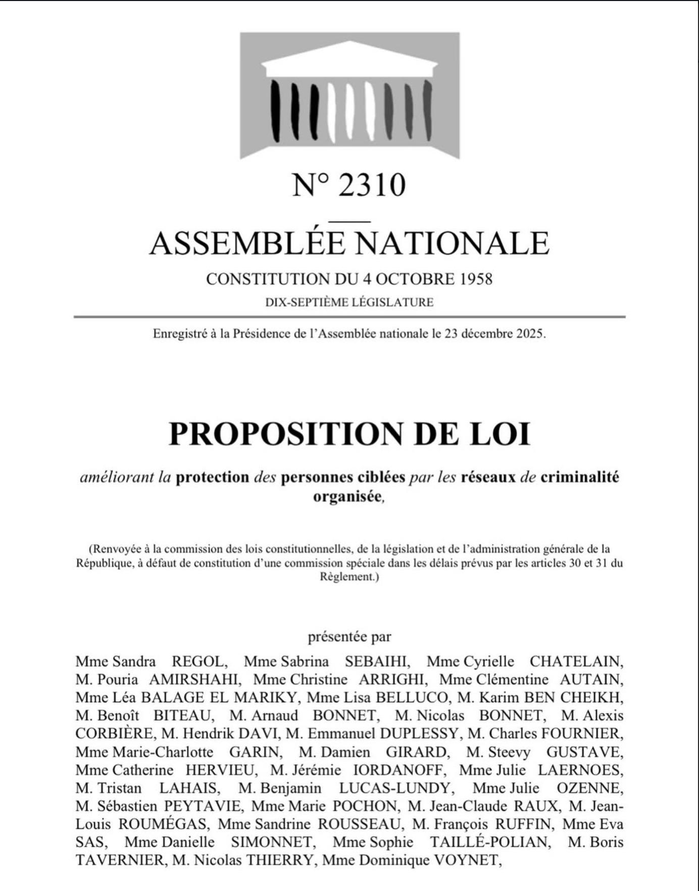 Cette proposition de loi répond à une réalité trop longtemps ignorée : partout en France, des citoyens, des parents, des militants associatifs, des jeunes engagés font face, souvent seuls, à des réseaux criminels violents et organisés. Leur engagement est un rempart démocratique essentiel contre l’extension du narcotrafic, mais il les expose directement aux menaces, aux intimidations et parfois au pire.